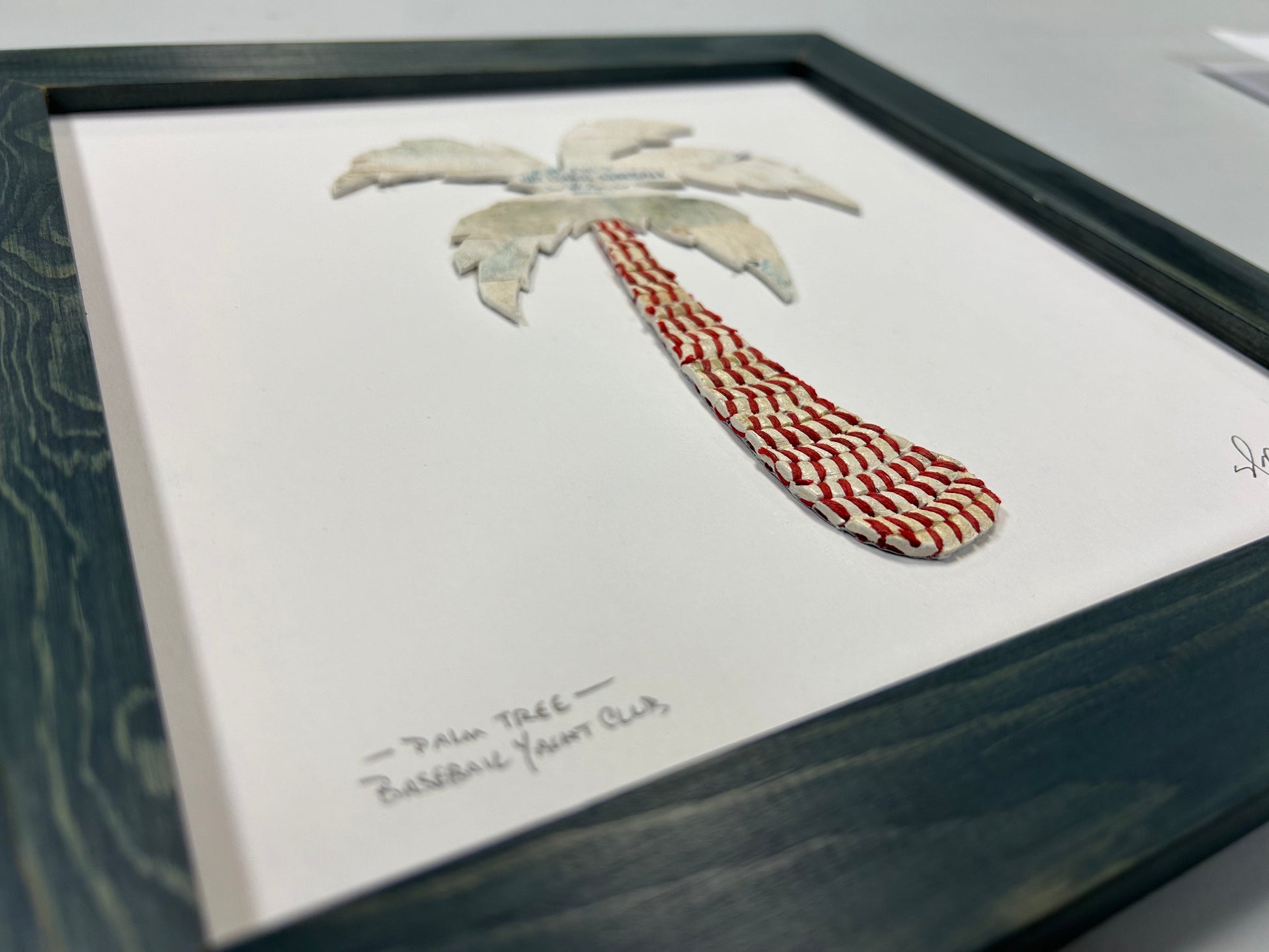 The Palm Tree artwork is made from the leather of several used baseballs. We source thousands of baseballs annually from all levels of play - from youth to professional leagues. Each artwork is one-of-a-kind and may contain portions of logos and markings from the reclaimed baseballs.